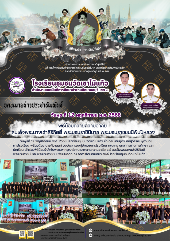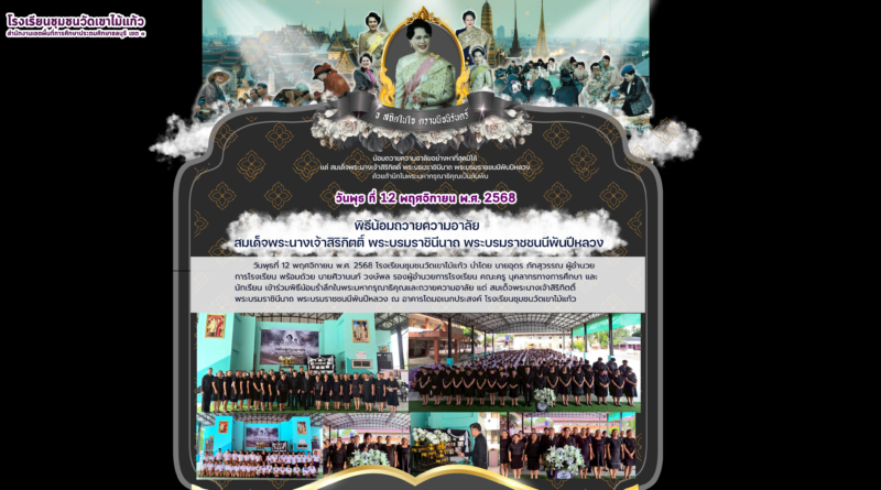 วันพุธที่ 12 พฤศจิกายน พ.ศ. 2568 โรงเรียนชุมชนวัดเขาไม้แก้ว นำโดย นายอุดร ภักสุวรรณ ผู้อำนวยการโรงเรียน พร้อมด้วย นายศิวานนท์ วงษ์พล รองผู้อำนวยการโรงเรียน คณะครู บุคลากรทางการศึกษา และนักเรียน เข้าร่วมพิธีน้อมรำลึกในพระมหากรุณาธิคุณและถวายความอาลัย แด่ สมเด็จพระนางเจ้าสิริกิตติ์ พระบรมราชินีนาถ พระบรมราชชนนีพันปีหลวง ณ อาคารโดมอเนกประสงค์ โรงเรียนชุมชนวัดเขาไม้แก้ว